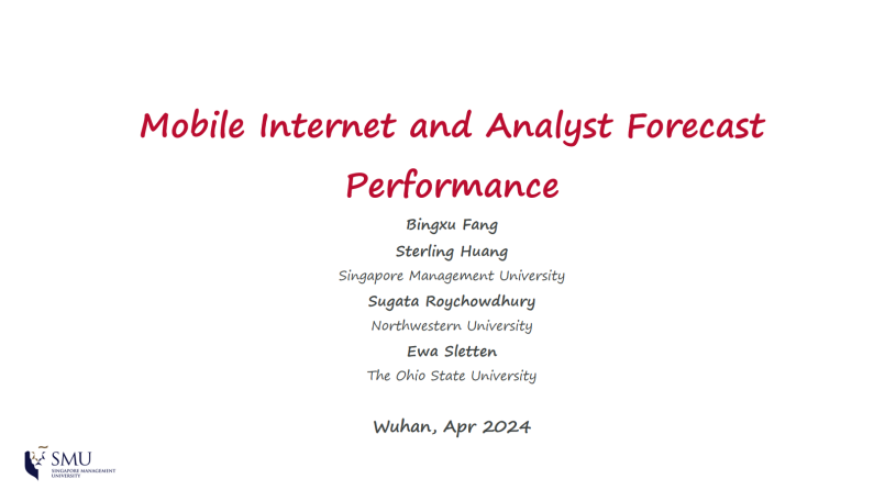 2024年4月23日下午15:00-16:30,会计学院第150次“中南· 会计Seminar”学术讲座在文泉南401顺利举行。本次学术讲座由郭俊杰副教授主持,邀请到了新加坡管理大学的Sterling Huang副教授进行了题为《Mobile Internet and Analyst Forecast Performance》的研究分享。讲座吸引了众多师生参与,现场气氛热烈,学术氛围浓厚。以下是讲座的主要内容。