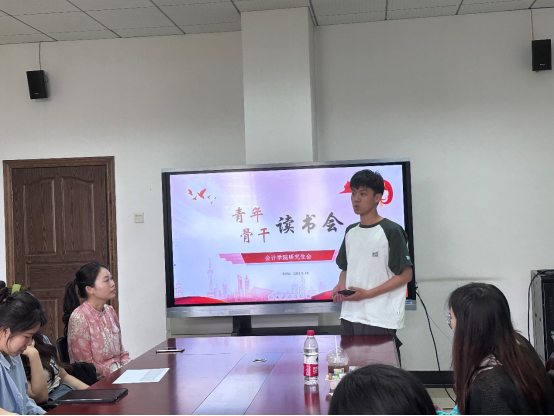 “习近平总书记在二十大报告中指出: '当代中国青年生逢其时,施展才干的舞台无比广阔,实现梦想的前景无比光明’。青年一代应坚定理想信念,练就过硬本领。深刻学习贯彻习近平新时代中国特色社会主义思想,高举马克思主义思想火炬,了解时代发展的要求、实践发展的需要、人民群众的愿望,才能最终明确个人理想,坚定未来发展方向”。读书会上,学院研究生会宣传部部门负责人、会计学硕研究生杜宇峰向在场师生汇报了思考与体悟。