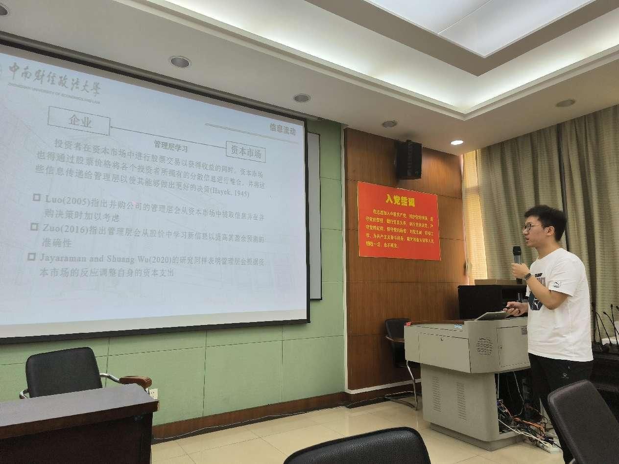 第二场活动,由王瑞麒向在场师生报告名为“分行业信息披露监管、知情交易与管理层学习效应”的论文。作者说明研究选择的样本以及数据来源,并对实证模型及相关指标进行详细介绍。通过一系列研究发现,分行业信息披露监管改革降低了知情交易,削弱了基于揭示价格效率的管理层学习效应。文章丰富了分行业信息披露监管的机制研究,为管理层学习提供了经验证据与理论借鉴。