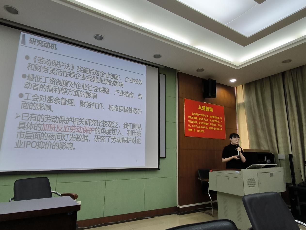 第一场活动,冯艺报告其最新研究成果,论文题目为“加班劳动与IPO抑价——来自中国城市夜间灯光的证据”。讲座伊始,冯艺对解释目前普遍存在的“996”“007”过度加班现象以引出研究背景。通过梳理相关领域已有研究,发现劳动保护会对企业IPO及企业经营业绩均产生影响。但是已有的劳动保护相关研究比较宽泛,作者则从具体的加班反应劳动保护的角度切入,利用城市层面的夜间灯光数据,研究了劳动保护对企业IPO抑价的影响。研究发现,城市夜间灯光强度与企业IPO抑价率呈显著的正相关关系,说明企业所在城市劳动保护越差,企业的IPO抑价率越高。异质性分析发现,劳动保护与对企业IPO抑价的影响在非国有企业、行业竞争度较高的企业和所在城市法律环境较好的企业中更为显著。除此之外,作者还细致地进行了稳健性检验、机制检验等,使得该研究更为严谨、缜密。