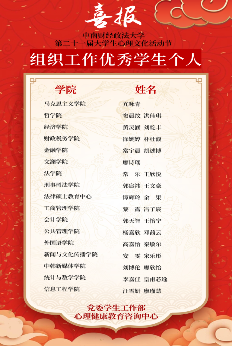 会计学院2022级本科生郭天智、王怡宁荣获学校第二十一届“5·25”大学生心理文化活动节“优秀个人”荣誉称号。