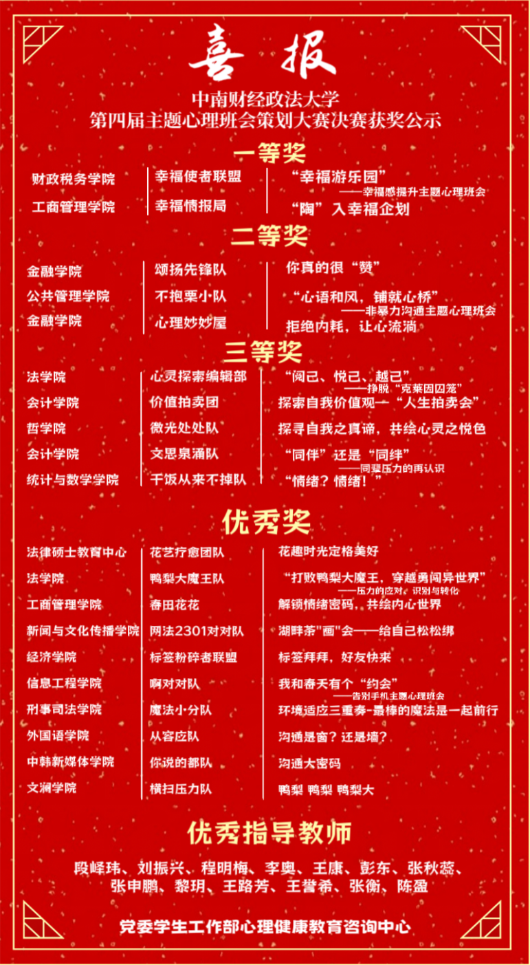 会计学院本科2022级财管2201班价值拍卖团队荣获学校第四届主题心理班会策划大赛三等奖,学硕2023级文思泉涌队荣获学校第四届主题心理班会策划大赛三等奖,黎玥、王誉希两位老师荣获“优秀指导教师”荣誉称号。
