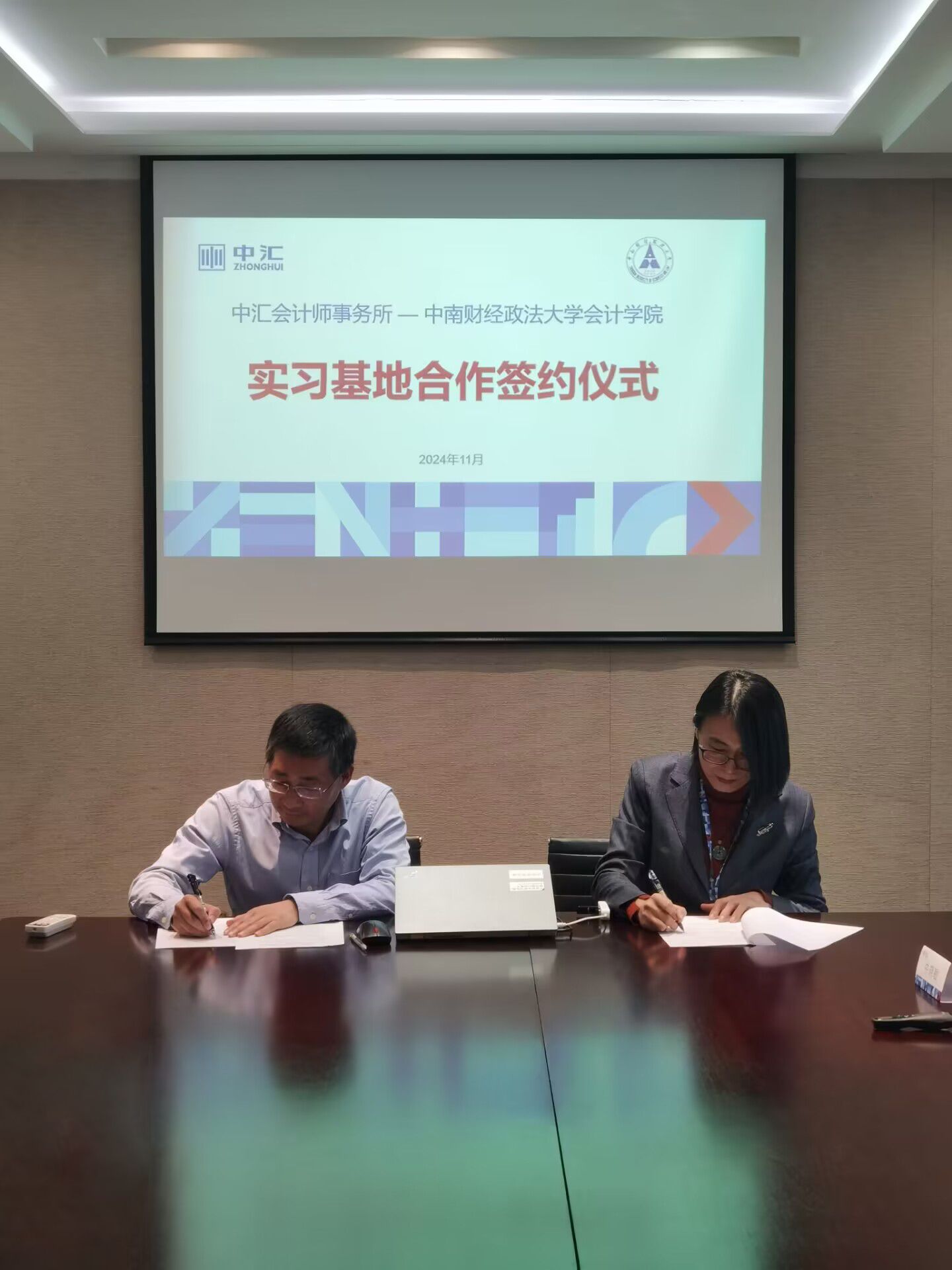会上,双方签署了合作培养会计、审计专业学位研究生协议,学院为中汇会计师事务所授牌建立“中南财经政法大学会计学院研究生实习实践基地”。