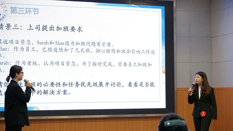 在职场情景模拟环节中,选手们通过六个真实职场情景:工作分配不均、团队合作冲突、上司要求加班、同事态度问题、客户反馈以及未曾挑战过的任务,全面探索职场中的复杂动态。十二名选手被随机分成六组,以完成任务和解决问题为目标,各自扮演不同角色。在各种情景中,他们面对的挑战涉及沟通协调、决策能力和危机处理等多方面,考验了选手的综合素质。每位选手都以非凡的专业能力和灵活的应变智慧,凭借出色的沟通技巧、严谨的逻辑思维以及精湛的表演能力,赢得了评委和观众的一致好评以及热烈的掌声。