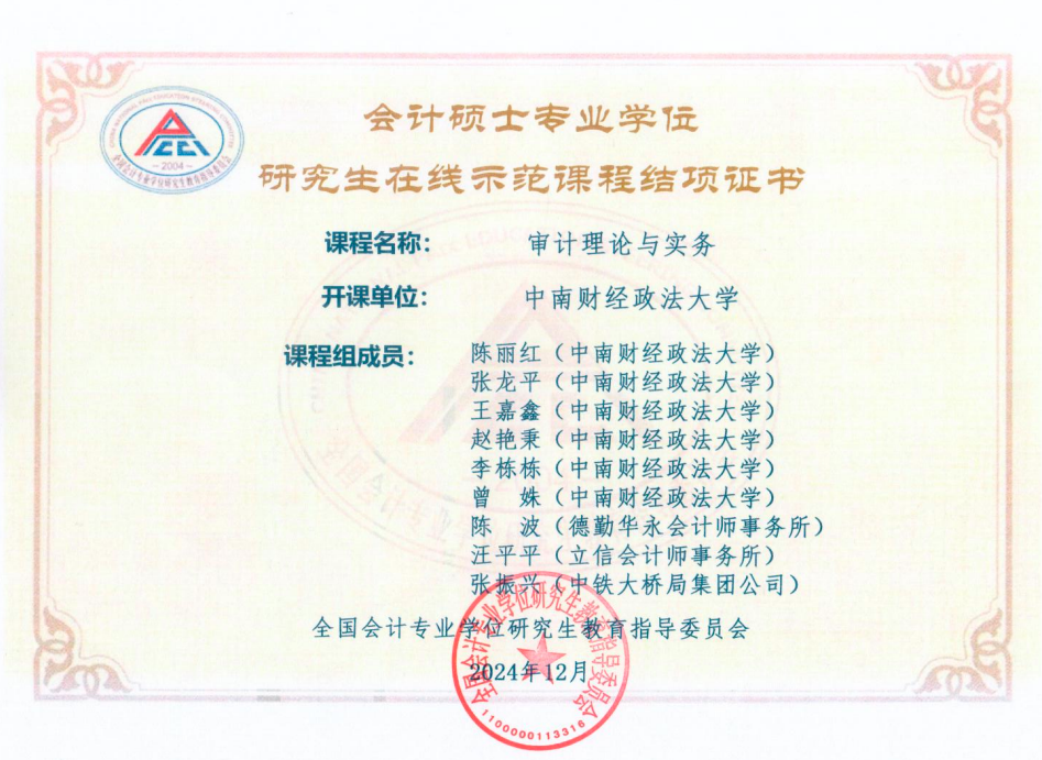 (通讯员:张昭妍)近日,接到全国会计专业学位研究生教育指导委员会关于全国专业学位研究生在线示范课程结项情况的通知,我院张敦力教授牵头建设的课程《财务管理理论与实务》,陈丽红教授牵头建设的课程《审计理论与实务》均顺利通过结项评审。